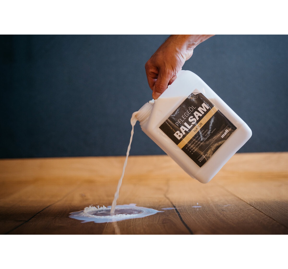 Informazioni ulteriori: Il balsamo all'olio curativo mafi è un olio emulsionato in acqua e va distribuito preferibilmente con uno strofinaccio di cotone. Con l'aiuto di una cuffia in lana di pecora è possibile lucidare alla fine il pavimento, per ottenere un bell'effetto lucido.